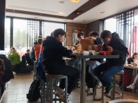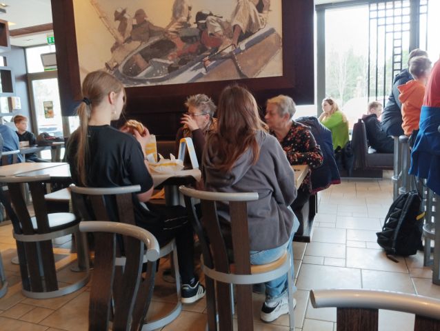W drodze powrotnej, w ramach integracji młodzieży i seniorów, odwiedziliśmy restaurację McDonalds, gdzie uczniowie opiekunowie pomagali i tłumaczyli seniorom, jak zamawiać jedzenie za pomocą kiosku (duży ekran dotykowy w restauracji). Podczas posiłku, seniorzy opowiadali jak to za ich czasu wyglądała technika. Wycieczka okazała się “strzałem w dziesiątkę”, wszyscy byli bardzo zadowoleni.