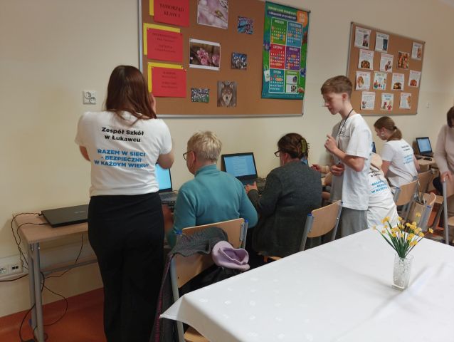 Seniorzy w parach omawiali sytuacje, kiedy ktoś próbuje poznać ich hasło, a oni muszą się przed tym bronić: logowanie w miejscu publicznym, poproszenie przypadkowej osoby o wpisanie hasła np. z notatnika, gdy ktoś podejrzy hasło, rozmowa z “policjantem” czy “pracownikiem” banku. Uczniowie podpowiadali jak skutecznie bronić się w takich sytuacjach: nie logować się w otwartych sieciach wifi, weryfikować adresy stron www, nie prosić nikogo o zalogowanie, weryfikować pracowników banku i policji.