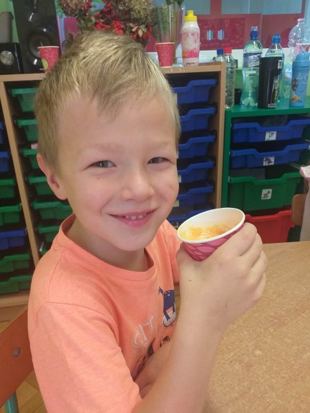 Sok marchwiowo – jabłkowy – wyciskany, gęsty zdrowy! Taki właśnie nasze przedszkolaki przygotowały w ramach kolejnych zajęć promujących zdrowie. Przy okazji poznały zasady piramidy żywienia.