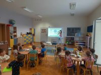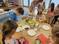 W trakcie spotkania z panią dietetyk dzieci uczestniczyły w warsztatach kulinarnych, podczas których wykonały samodzielnie posiłek. Pani dietetyk pokazała naszym przedszkolakom, jak dobierać odpowiednio produkty, które są bogate w witaminy i cenne składniki odżywcze. Po zakończonych warsztatach dzieci mogły skonsumować przygotowany przez nich posiłek.
