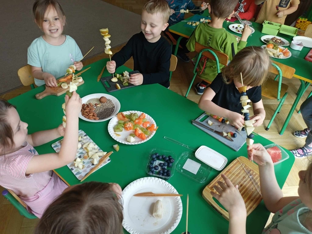 Fantastyczne warsztaty z dietetykiem zorganizowane w przedszkolu pogłębiły wiedzę dzieci na temat zdrowego odżywiania. Na początku dzieci dowiedziały się, co to znaczy jeść zdrowo i dlaczego jest to ważne dla ich zdrowia i samopoczucia. Dietetyk opowiedział im o różnych grupach pokarmowych, o tym, jakie witaminy i minerały zawierają owoce i warzywa, oraz dlaczego warto je jeść codziennie. Następnie przyszedł czas na praktykę! Każda grupa dzieci dostała talerzyki, patyczki do szaszłyków oraz świeże owoce. Dzieci mogły wybierać spośród wielu kolorowych owoców, takich jak jabłka, gruszki, kiwi, truskawki, banany i inne ulubione smakołyki. Pod okiem nauczycieli i dietetyka dzieci samodzielnie układały kawałki owoców na patyczkach, tworząc swoje unikalne szaszłyki. Było to nie tylko kreatywne zajęcie, ale także świetna okazja do rozmowy o smakach, zapachach i kolorach owoców. Dzieci dzieliły się swoimi ulubionymi owocami oraz wymieniały się pomysłami na zdrowe przekąski. Nie zabrakło także momentów radości i śmiechu, gdy przedszkolaki eksperymentowały z różnymi układami owoców na swoich szaszłykach.