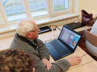Uczniowie wraz z seniorami podzielili się na grupy. Natalia na tablicy interaktywnej pokazywała jak wyszukiwać utwory i tworzyć playlisty – to samo wykonywali seniorzy z pomocą uczniów. Następnie seniorzy starali się udostępniać swoje playlisty innym seniorom. W trakcie tego ćwiczenia, w pracowni zapanowały dźwięki utworów lubianych przez seniorów. Zrobiło się bardzo wesoło i radośnie. Widać było, że seniorom bardzo spodobało się ćwiczenie.