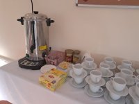 Tak jak ostatnio uczniowie czekali na seniorów w holu szkoły i przyprowadzali ich do pracowni, gdzie odbywają się zajęcia. Seniorzy byli bardzo miło zaskoczeni ustawieniem i wystrojem sali, którą przerobiliśmy na kawiarnię. Zaplanowaliśmy trzy stoliki. Uczniowie zrobili kwiatki z bibuły, panie z obsługi szkoły wyprasowały obrusy, a nasza pani kucharka przygotowała znów poczęstunek oraz kawę i herbatę.