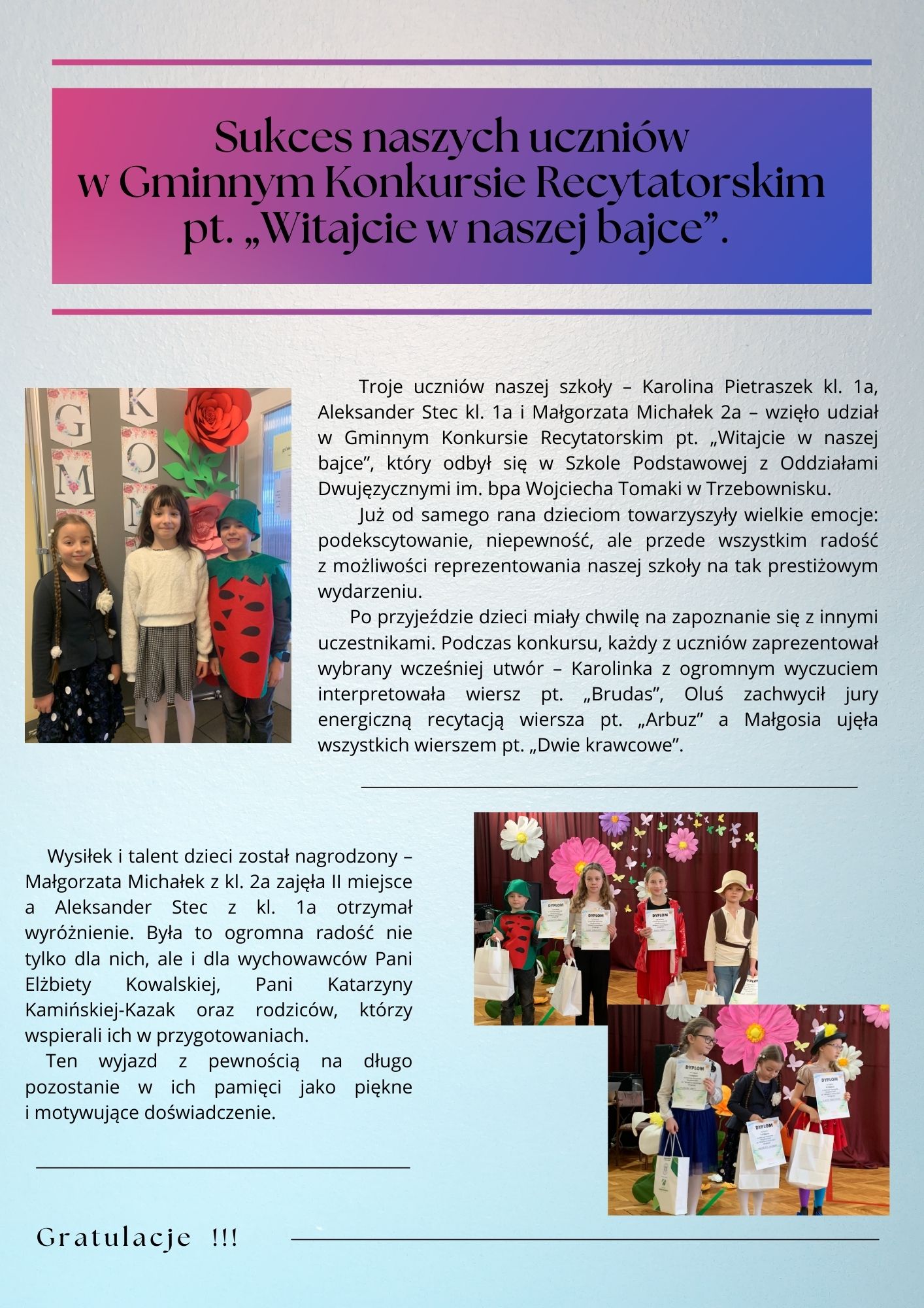 Martyna Morawski oprócz śpiewania w języku angielskim, grała również na skrzypcach i zajęła I miejsce w swojej kategorii. Natomiast Amelia Nowak zajęła III miejsce w kategorii klas 7-8. Gratulujemy serdecznie i życzymy dalszych sukcesów.