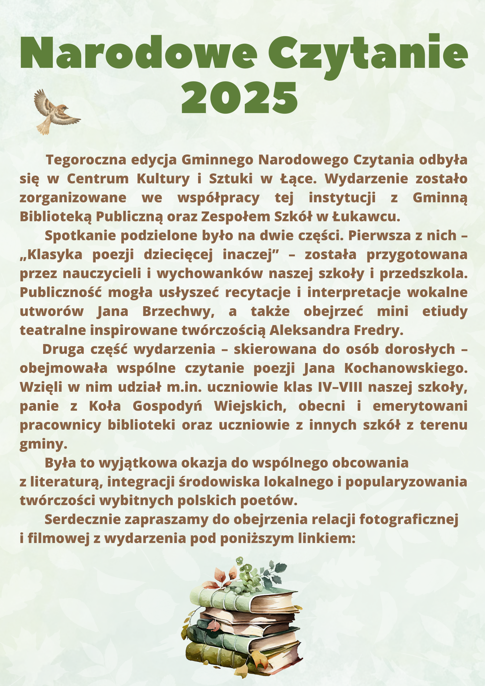 Tegoroczne hasło promujące Akcję, w pełni oddaje ideę wspólnej troski o środowisko. Jest to Akcja która ma wyjątkową moc łączenia ludzi w ich wysiłkach dla dobra przyrody. Odpady zanieczyszczające naszą planetę, stanowią zagrożenie dla natury i jednocześnie człowieka. Na szczęście optymizmem napawa ekologiczna postawa naszych uczniów, dla których los Ziemi nie pozostaje obojętny. Posiadając wiedzę, którą zdobyli na lekcjach dotyczącą między innymi segregacji śmieci oraz zaopatrzeni w worki i rękawiczki, zebrali sporą ilość odpadów, które zaśmiecały teren wokół szkoły i przedszkola.