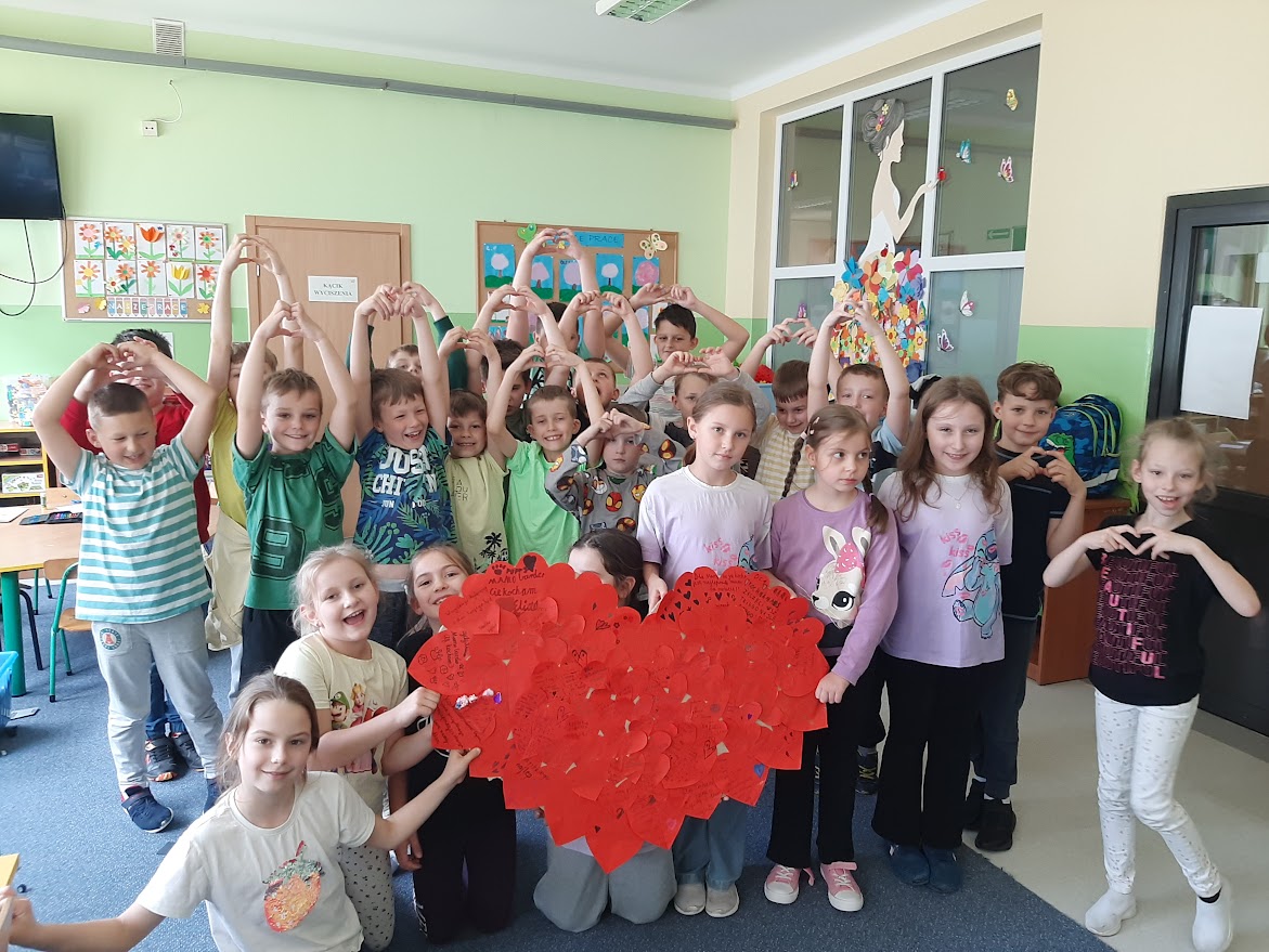 z udziałem uczniów klas 1-3. Dzieci miały okazję połączyć kreatywność z serdecznością, tworząc kolorowe serca z życzeniami. Każde dziecko przygotowało własne serduszko, na którym zapisało miłe słowa, życzenia lub pozytywne przesłania dla swoich Mam.