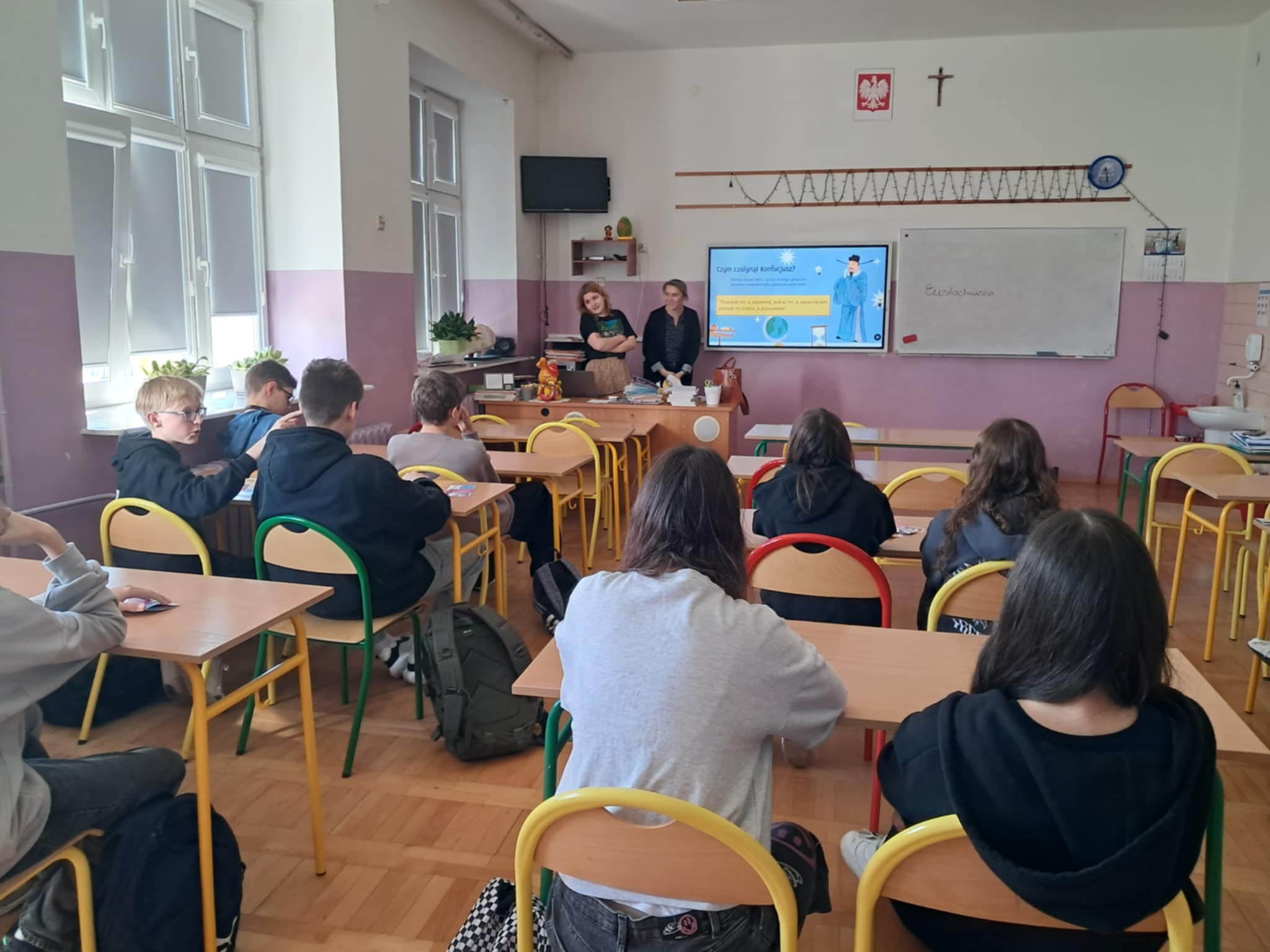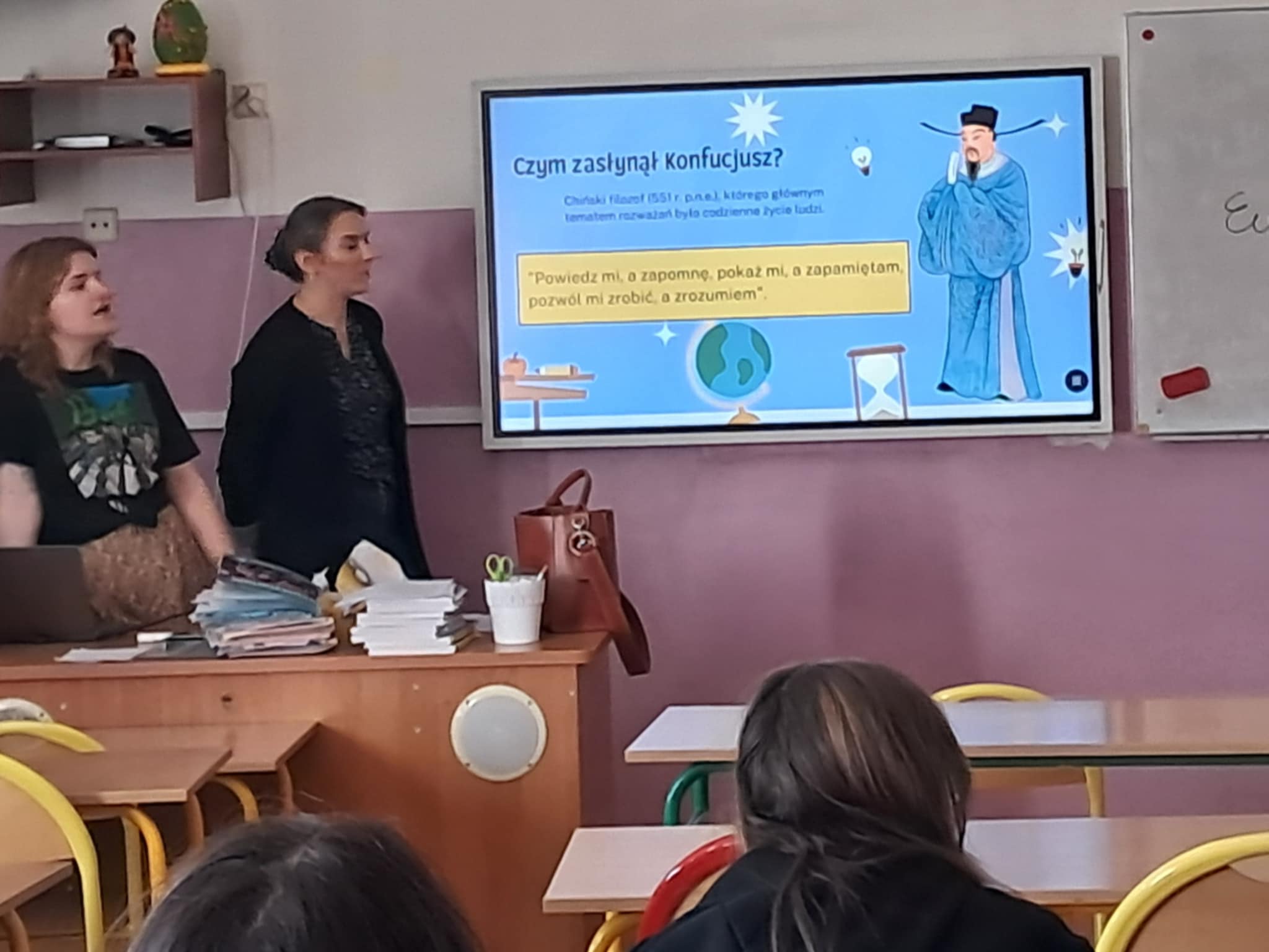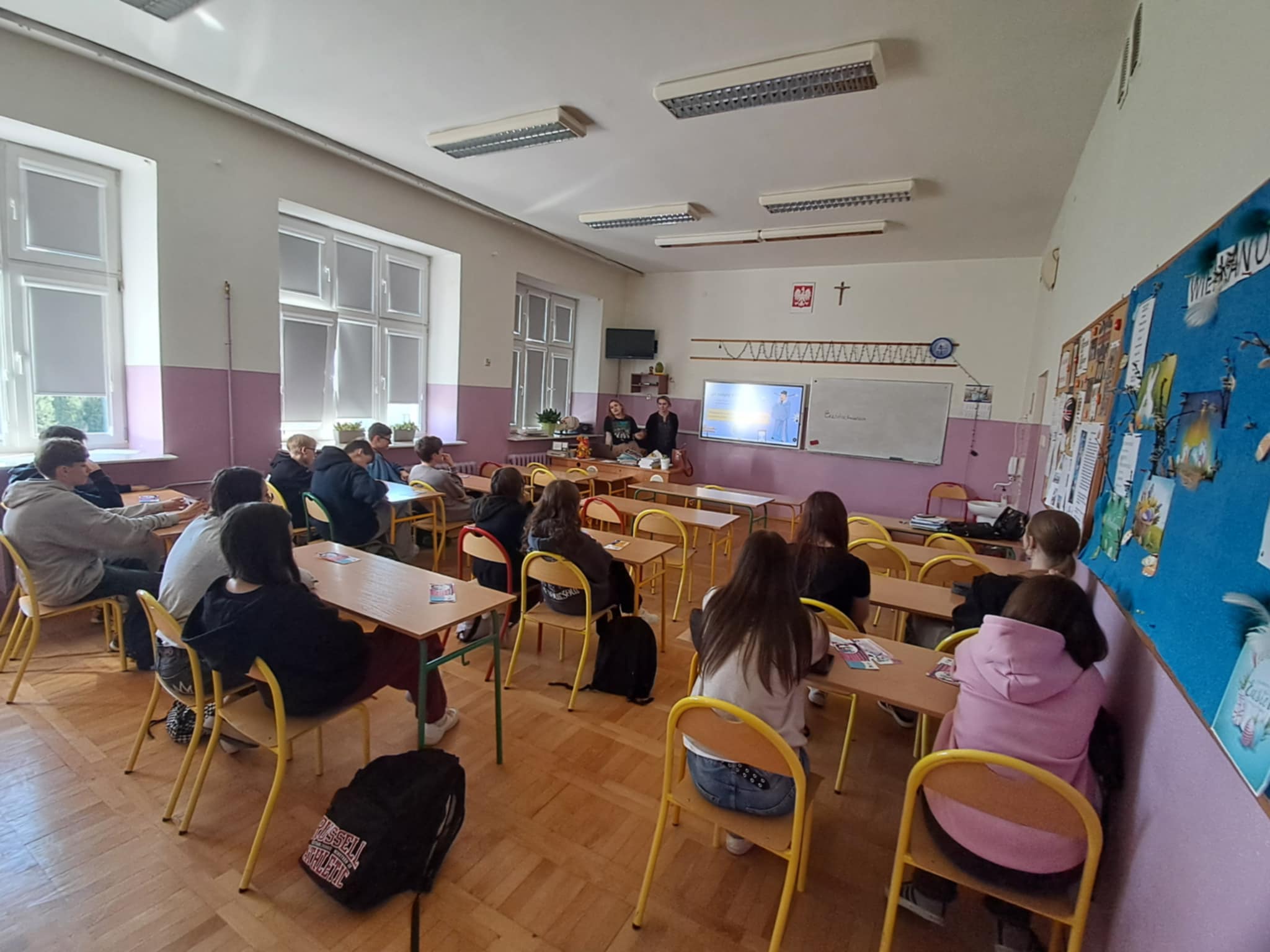 3 kwietnia 2025 r. w naszej szkole gościliśmy przedstawicieli Zespołu Szkół Ekonomicznych w Rzeszowie. Zajęcia odbyły się w ramach projektu związanego pracy. Klasa 8 wzięła udział w lekcji zatytułowanej: „Czy Konfucjusz miał rację? - Rynek pracy dziś i jutro –perspektywy dla młodych”. Nauczyciele przybliżyli naszym uczniom zagadnienia związane z poszukiwaniem pracy, wymogami stawianymi przyszłym pracownikom przez pracodawców, oraz poszukiwanymi obecnie profesjami. Uczniowie pracując w grupach tworzyli portret pracownika przyszłości, wypowiadali się nt. kompetencji miękkich i twardych istotnych na rynku pracy, oraz dyskutowali o zawodach przyszłości. Zajęcia te nie tylko poszerzyły wiedzę młodzieży na temat rynku pracy, ale również pomogły im zastanowić się nad własnymi predyspozycjami, zainteresowaniami i planami na przyszłość. Dały możliwość refleksji nad słowami Konfucjusza: „Wybierz pracę którą kochasz i nie przepracujesz ani jednego dnia więcej w Twoim życiu”.