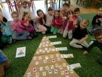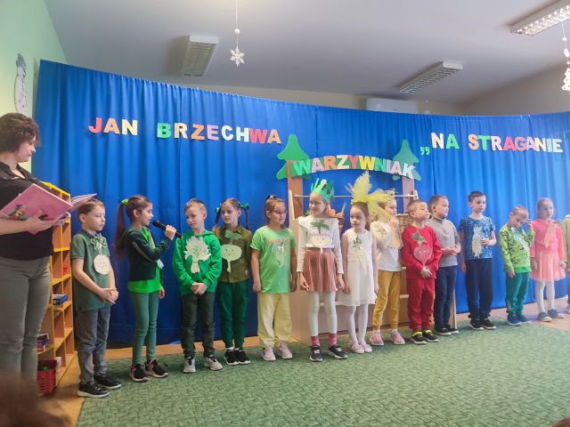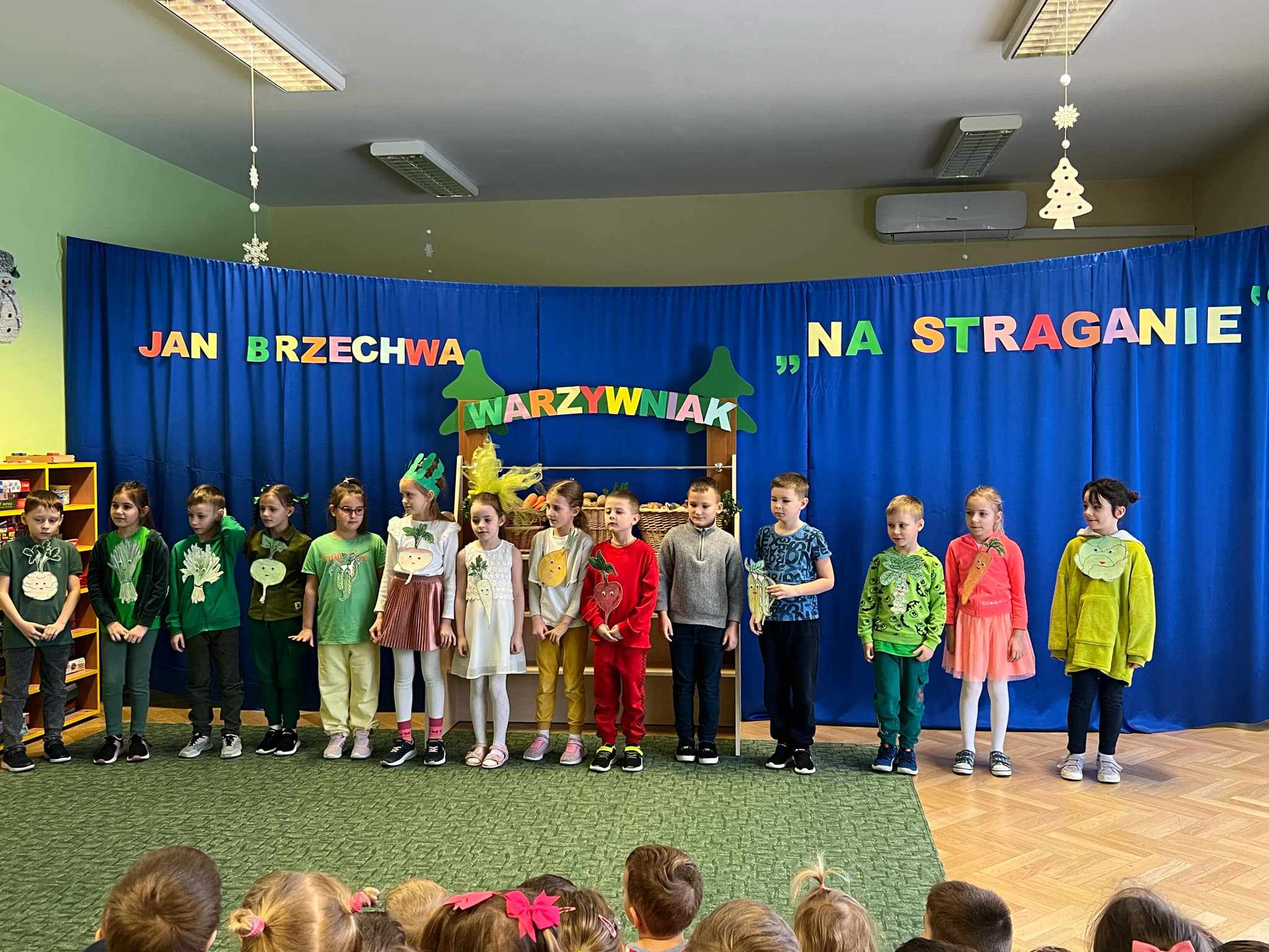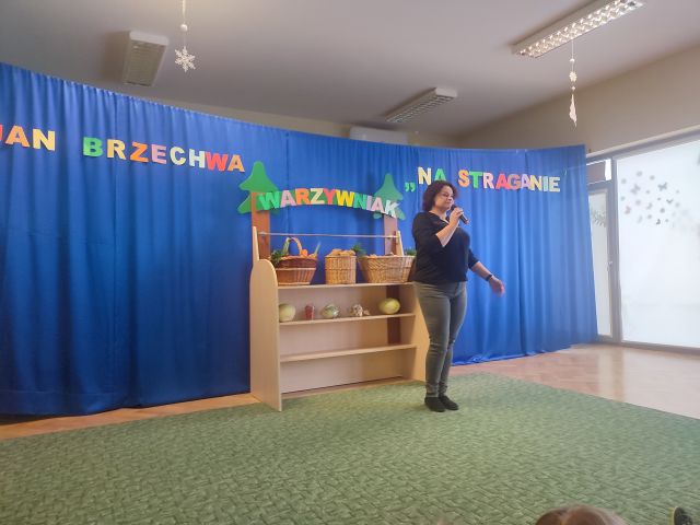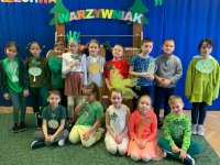 Dzieci z grupy „Liski” wraz ze szkolnymi kolegami z klasy I przygotowały przedstawienie "Na straganie" oparte o wiersz J. Brzechwy i mogły je zaprezentować przedszkolnej publiczności w dniu 16 stycznia 2025 r. Było ono sfinalizowaniem jesiennego etapu projektu "Zdrowo jem, więcej wiem" i okazją do porozmawiania z przedszkolakami wszystkich grup na temat znaczenia warzyw dla zdrowia. Realizacja tego projektu doskonale wkomponowuje się w uczestnictwo w programie Przedszkole Promujące Zdrowie. Dziękujemy również rodzicom za kolejny rok.