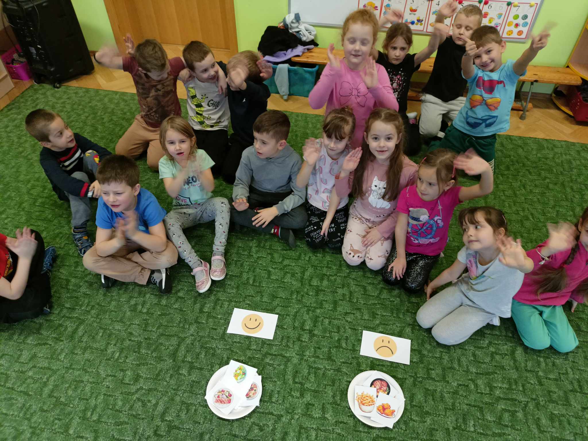 Podczas zabawy dzieci same segregowały produkty spożywcze, układając je na wielkim plakacie piramidy zdrowia. Miały też okazję przygotować własne zdrowe kanapki, dobierając pełnowartościowe składniki. Nie zabrakło również zabaw ruchowych, podczas których przedszkolaki udawały produkty spożywcze i wspólnie układały piramidę z siebie! Było to nie tylko wesołe doświadczenie, ale także sposób na lepsze zrozumienie, jak ważna jest różnorodność w codziennym menu. Zajęcia o zdrowym odżywianiu to doskonała okazja, by poprzez zabawę zaszczepić w dzieciach świadomość, że zdrowe jedzenie może być smaczne i kolorowe. Grupa „Liski” z entuzjazmem przyswajała wiedzę i aktywnie uczestniczyła w każdej aktywności.