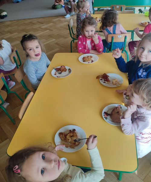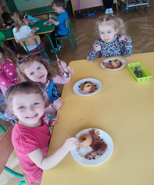 Pieczone jabłka to pyszny i zdrowy deser, który ma wiele walorów odżywczych. Jabłka są bogate w błonnik, witaminy (zwłaszcza witaminę C) oraz antyoksydanty, co sprawia, że są korzystne dla zdrowia każdego człowieka. I właśnie w przedszkolu najpierw na Gminnym Przeglądzie Recytatorskim „Jak dorosnę to zostanę ...” 21 marca na poczęstunku dla przybyłych gości, a potem 27 marca na drugie śniadanie można było poczuć rozchodzący się, przyjemny, słodki zapach pieczonych jabłuszek, jako słodką przekąskę. Dzieci z wielką ciekawością smakową degustowały ten wspaniały deser. Pieczone jabłka nie tylko zachowują swoje wartości odżywcze, ale też są łatwiejsze do strawienia. I jest to doskonały sposób na zdrową przekąskę.