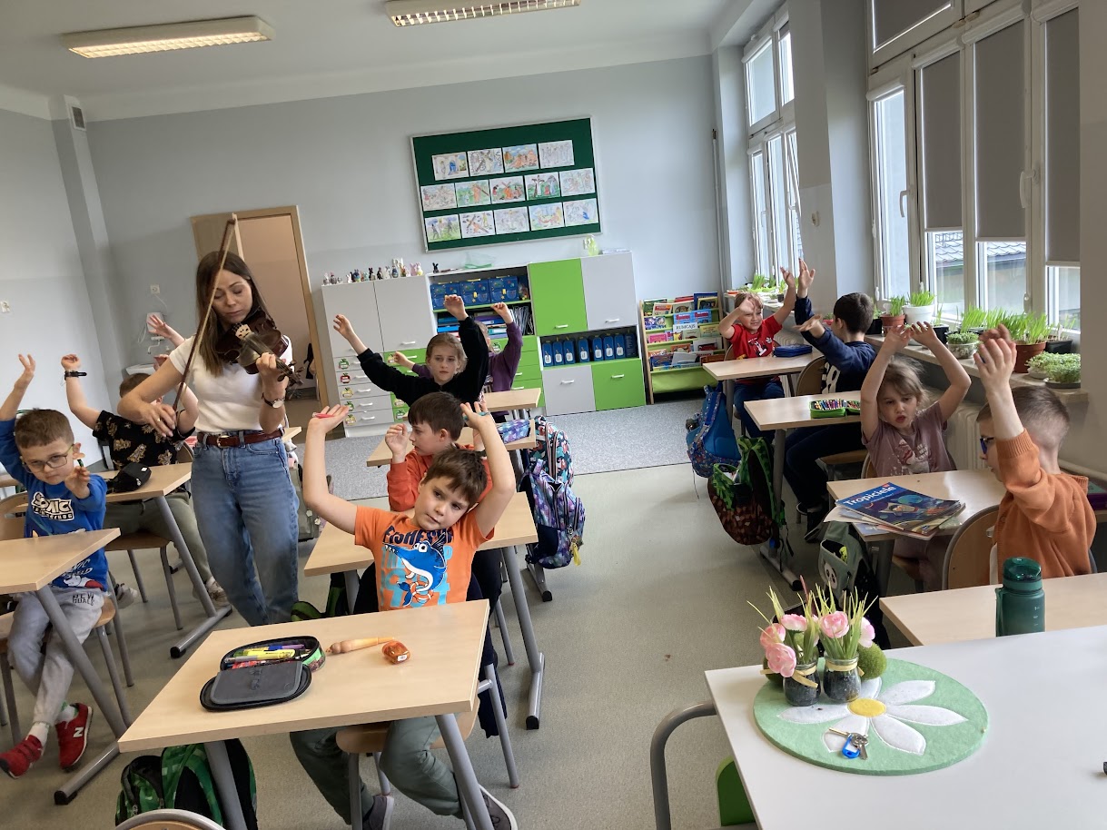 Podczas zajęć w klasie 1a, Pani wychowawczyni zaprezentowała grę na skrzypcach, wprowadzając...