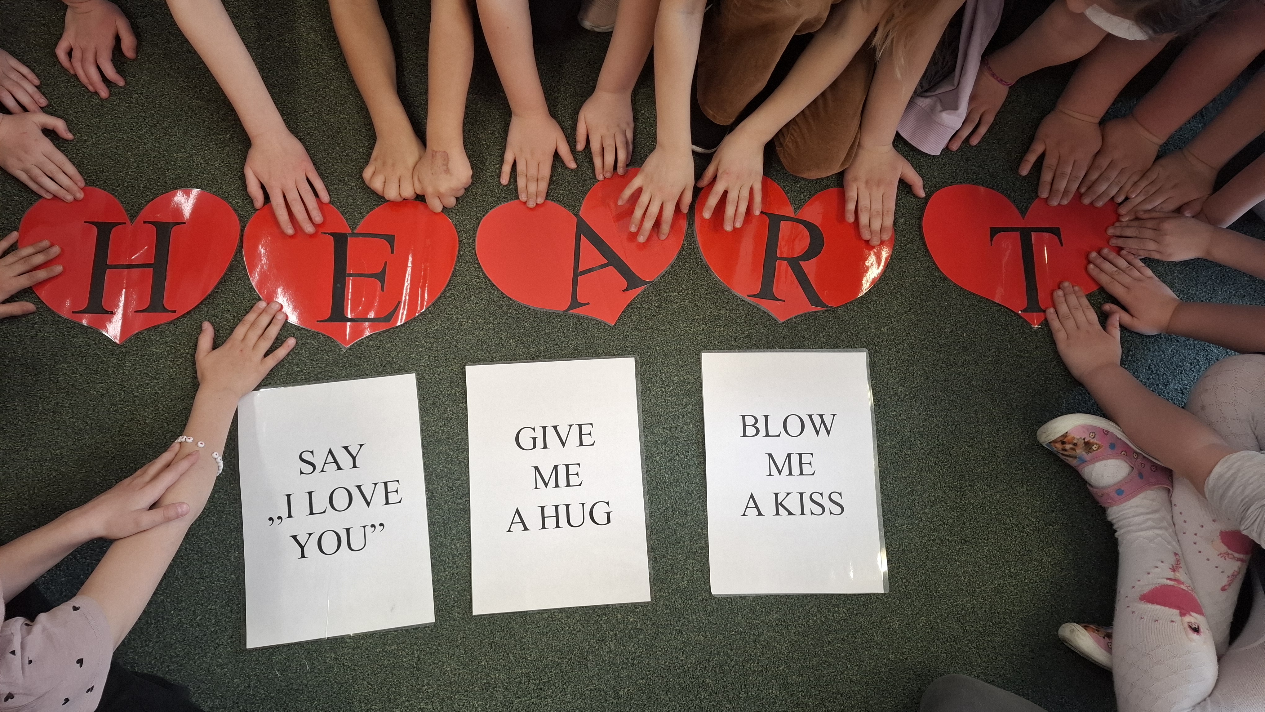 Nie mogło zabraknąć serc oraz piosenki Valentine's Day Song - H-E-A-R-T. Dzieci nauczyły się także za pomocą jakich zwrotów i gestów okazuje się uczucia w języku angielskim.