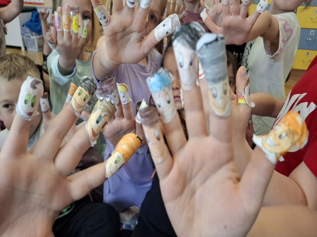 Nawiązując do motywu przewodniego tygodnia jakim jest Teatr, dzieci w ramach zajęć z języka angielskiego wykonały pacynki. Wykorzystaliśmy je aby wprowadzić nowe słownictwo oraz element fantazji i interakcji. Przedszkolaki nauczyły się piosenki " Finger family song" którą wykorzystaliśmy jako teatrzyk paluszkowy do przyswojenia nowych zagadnień z języka angielskiego poprzez zabawę.