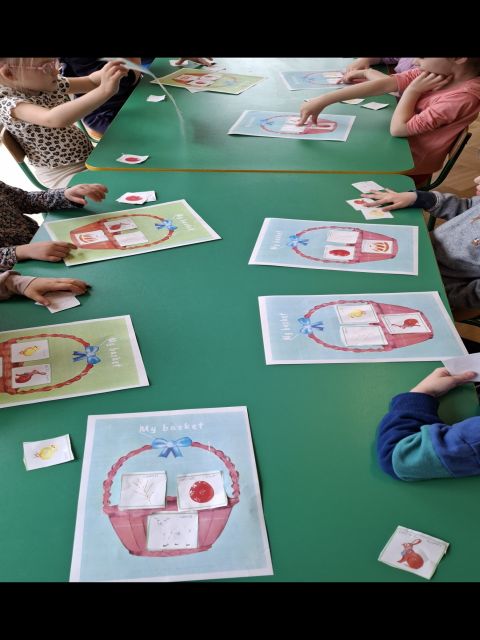 Przedszkolaki objęte innowacją pedagogiczną z języka angielskiego uczestniczyły w grze "Roll your basket", gdzie zgodnie z wyznaczonym kodem kompletowały swoje własne koszyki wielkanocne. Utrwalając słownictwo nie mogło zabraknąć ulubionej zabawy przedszkolaków -"Who took my cookie?". Dużą radość dzieciom sprawiła także dźwiękowa książeczka o króliku "Hop with me!".