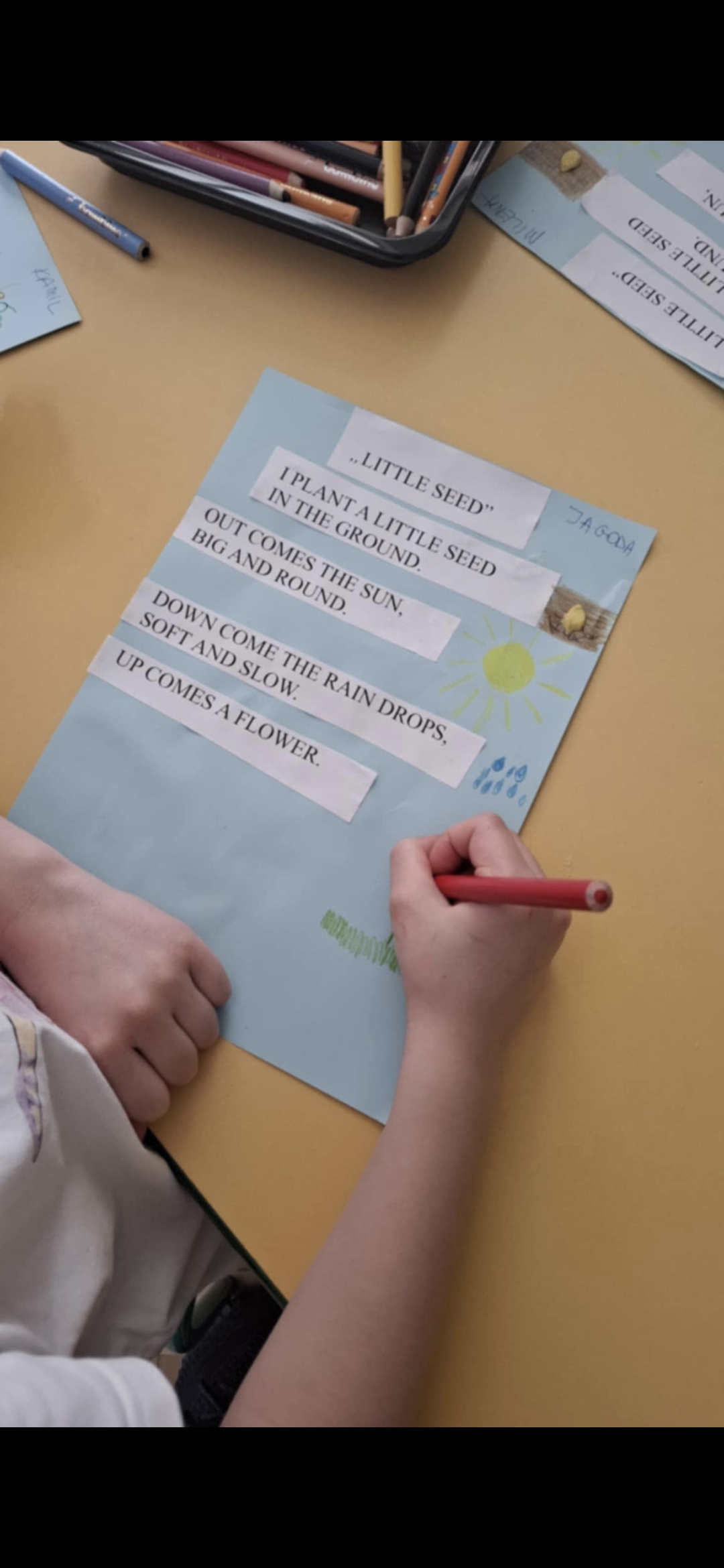 Korzystając z wiosennej tematyki, dzieci objęte innowacją z języka angielskiego wykonały rysowany wierszyk o wzrastającym nasionku " Little seed" . Jest to metoda łączenia nauki języka z plastyką. Dzieci rysowały proste elementy zgodnie z instrukcjami w krótkim wierszu. W ten sposób uczyły się nowego słownictwa, rozwijały motorykę małą oraz angażowały pamięć.