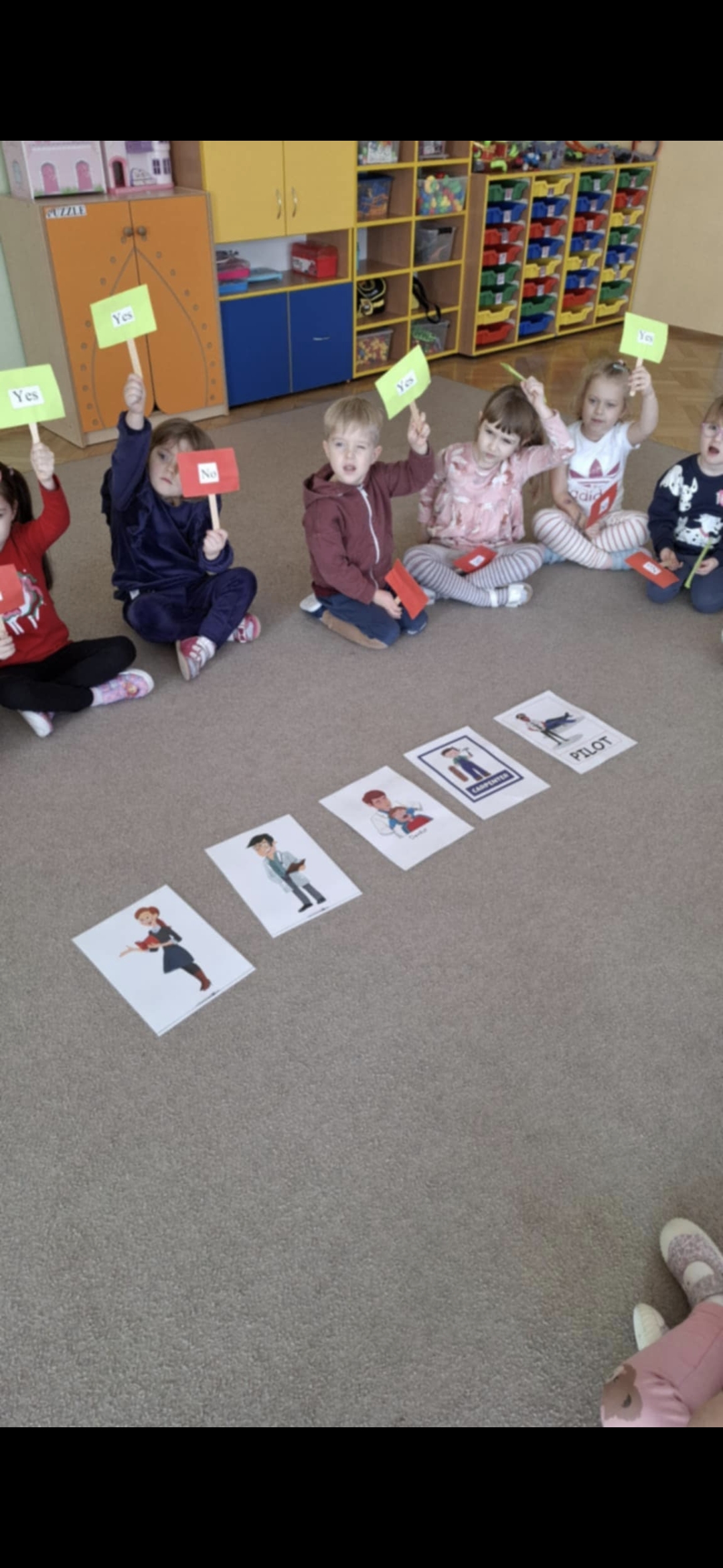 Dzieci objęte innowacją pedagogiczną z języka angielskiego poznały wiele nazw zawodów. Utrwalały słownictwo poprzez zabawę z kartami flashcards, plakietkami YES/NO, obrazując ruchem treść piosenki "What do you do ? " serii Fun kids English, przeglądając sensoryczną książeczkę " Where is my tractor ? " oraz wykonując pracę plastyczną pt. I"m a doctor ! / I'm a pilot !