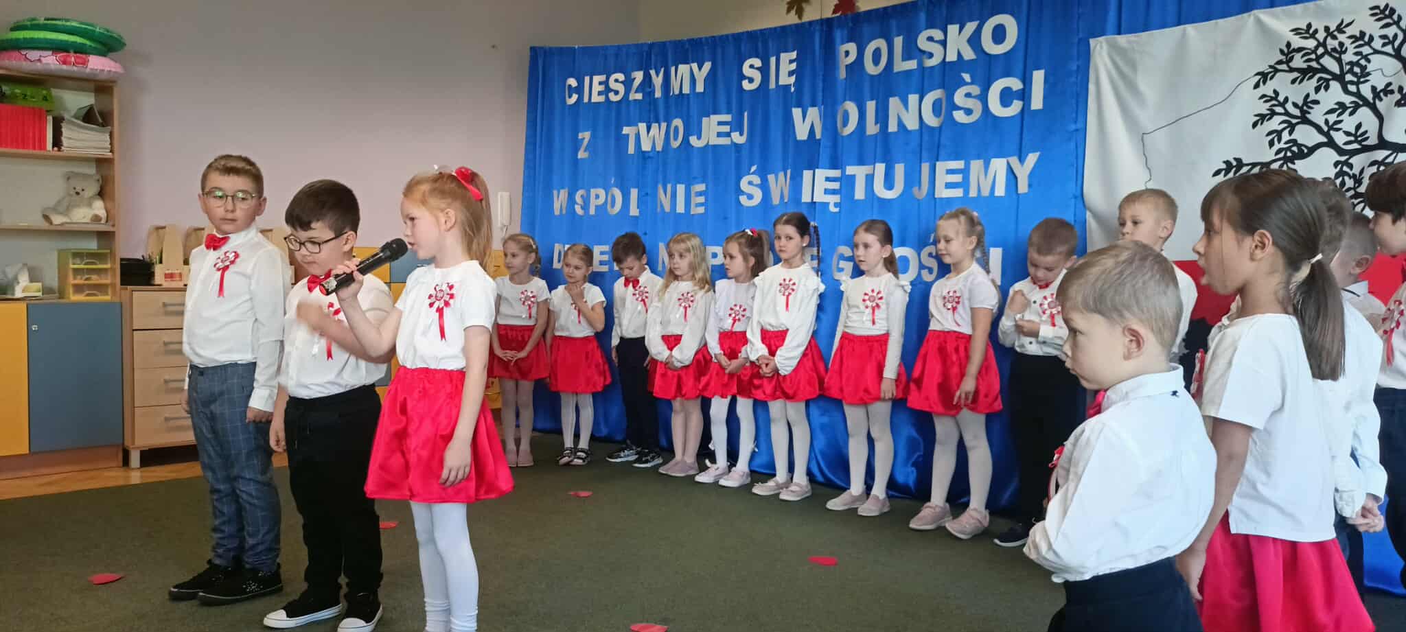 W ramach obchodów Dnia Niepodległości grupa „Wiewiórek” (zerówka) zaprosiła wszystkie przedszkolaki na montaż słowno – muzyczny, przygotowany pod okiem nauczycielek: Barbary Płonki – Kloc i Janiny Kaproń z pomocą pań: Małgorzaty Kasiak i Moniki Szalachy. Po nim młodzi patrioci udali się grupami pod pomnik, aby uczcić pamięć tych, którzy polegli w walce o naszą Ojczyznę.