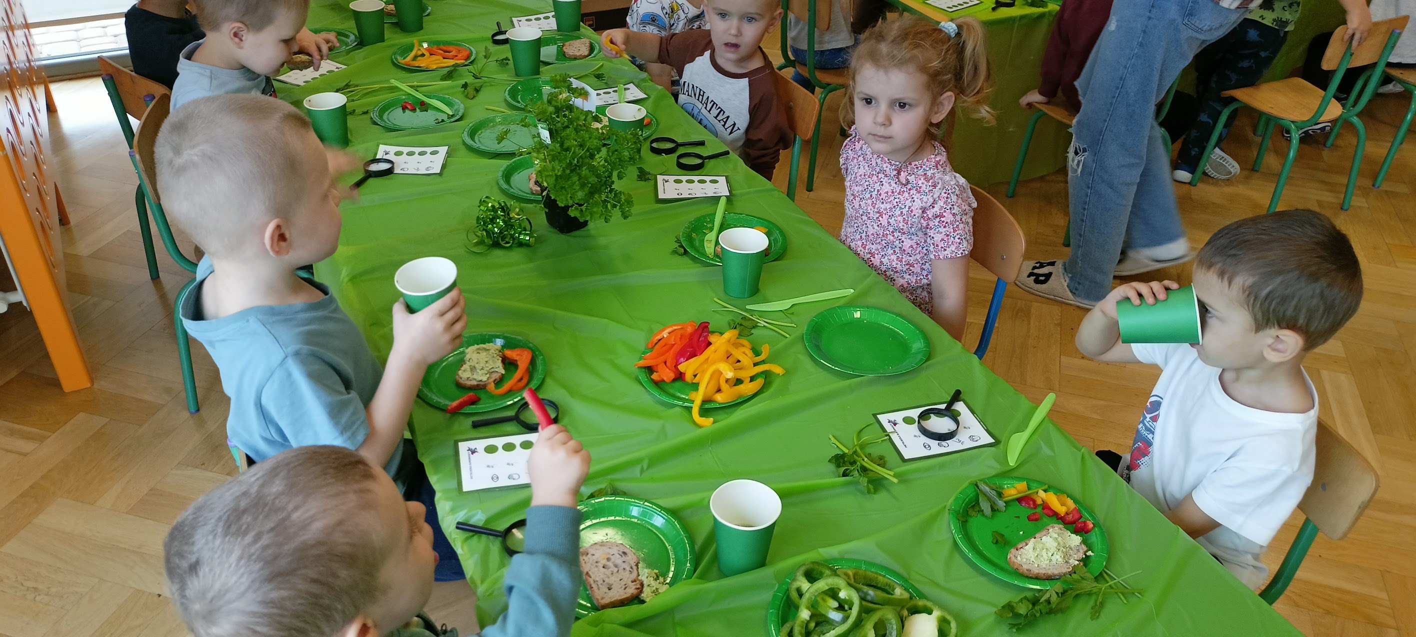 W ramach tych zajęć, prowadzonych przez wykwalifikowaną panią dietetyk, przedszkolaki wszystkich grup mogły wielozmysłowo poznać zdrowe i kolorowe warzywa, owoce i nie tylko oraz skosztować własnoręcznie przygotowanych z nich: pasty i soku.